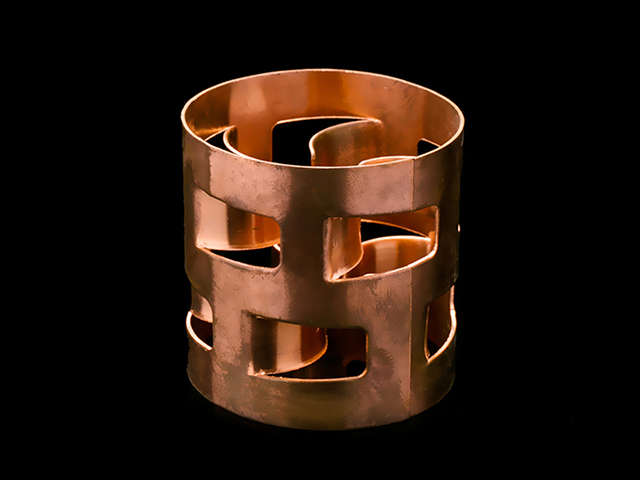 純銅鮑爾環(huán)填料是一種高徑相等的開孔環(huán)型填料,每層窗孔有5個舌葉,每個舌葉內(nèi)彎指向環(huán)心,上下兩層窗孔的位置相反錯開,一般開孔面積約占環(huán)壁總面積的30%左右。具有空隙率大,壓降和傳質(zhì)單元高度低,泛點(diǎn)高、汽液接觸充分、比重小、傳質(zhì)效率高等特點(diǎn)。這種結(jié)構(gòu)改善了汽液分布,充分利用了環(huán)的內(nèi)表面,從而使得填料塔內(nèi)的氣體和液體能夠從窗體自由通過。鮑爾環(huán)填料具有通量大、阻力小、分離效率高及操作彈性大等優(yōu)點(diǎn),在相同的降壓下,處理量可較拉西環(huán)大50%以上。它采用金屬薄板沖扎制成,在環(huán)壁上開出了兩排帶有內(nèi)伸舌葉的窗孔,每排窗有五個舌葉彎入環(huán)內(nèi),指向環(huán)心,在中心處幾乎相搭,上下兩層窗孔的位置相互錯開,一般開孔的總面積約為整個環(huán)面積的35%左右。由于在環(huán)壁上開了許多窗孔,使得填料層內(nèi)的氣、液分布情況及傳質(zhì)性能比拉西環(huán)有較大的改善。在同樣處理量時,降壓可降低一半,傳質(zhì)效率可提高20%左右。與拉西環(huán)比較,這種填料具有生產(chǎn)能力大、阻力小、操作彈性大等特點(diǎn),同樣處理時壓降比拉西環(huán)小50%-70%,塔高也有降壓,采用鮑爾環(huán)可以比拉西環(huán)節(jié)約20%-40%填料容積。